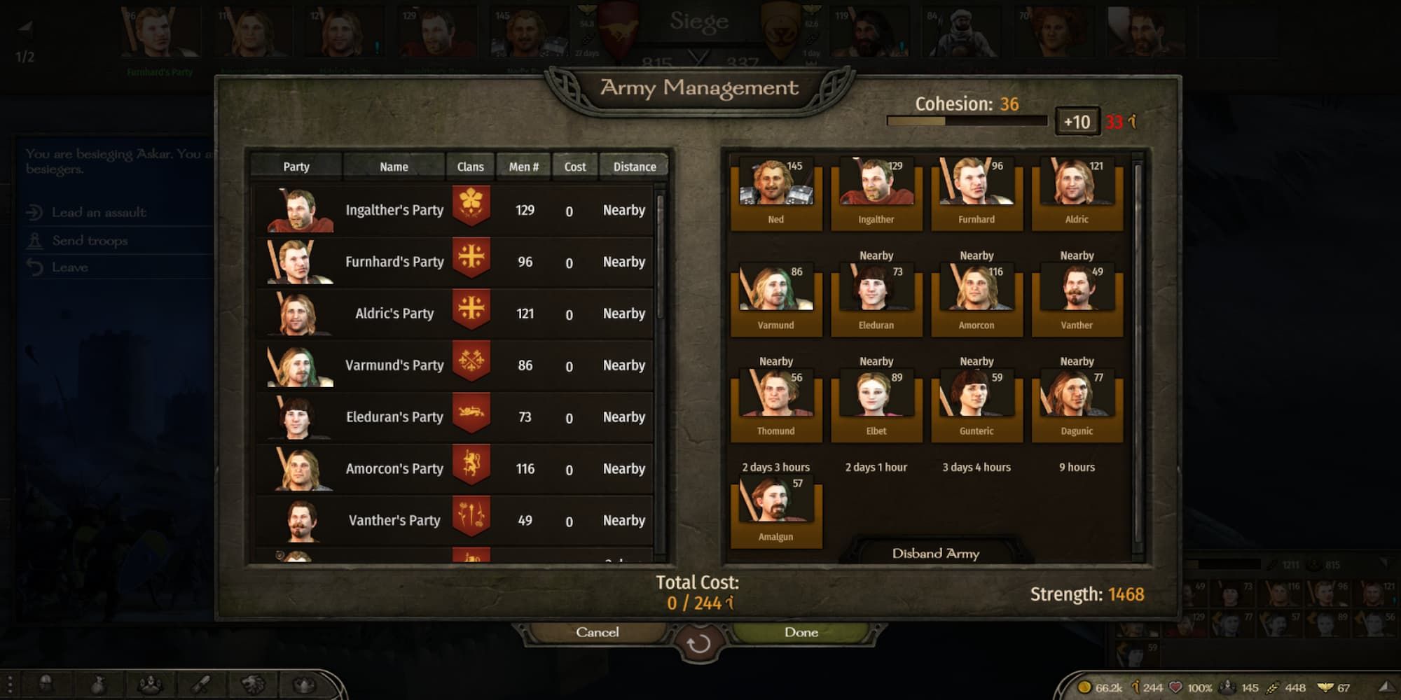Disbanding: If cohesion hits 0, the army automatically disbands. Lords will go their separate ways, usually leaving you alone deep in enemy territory.